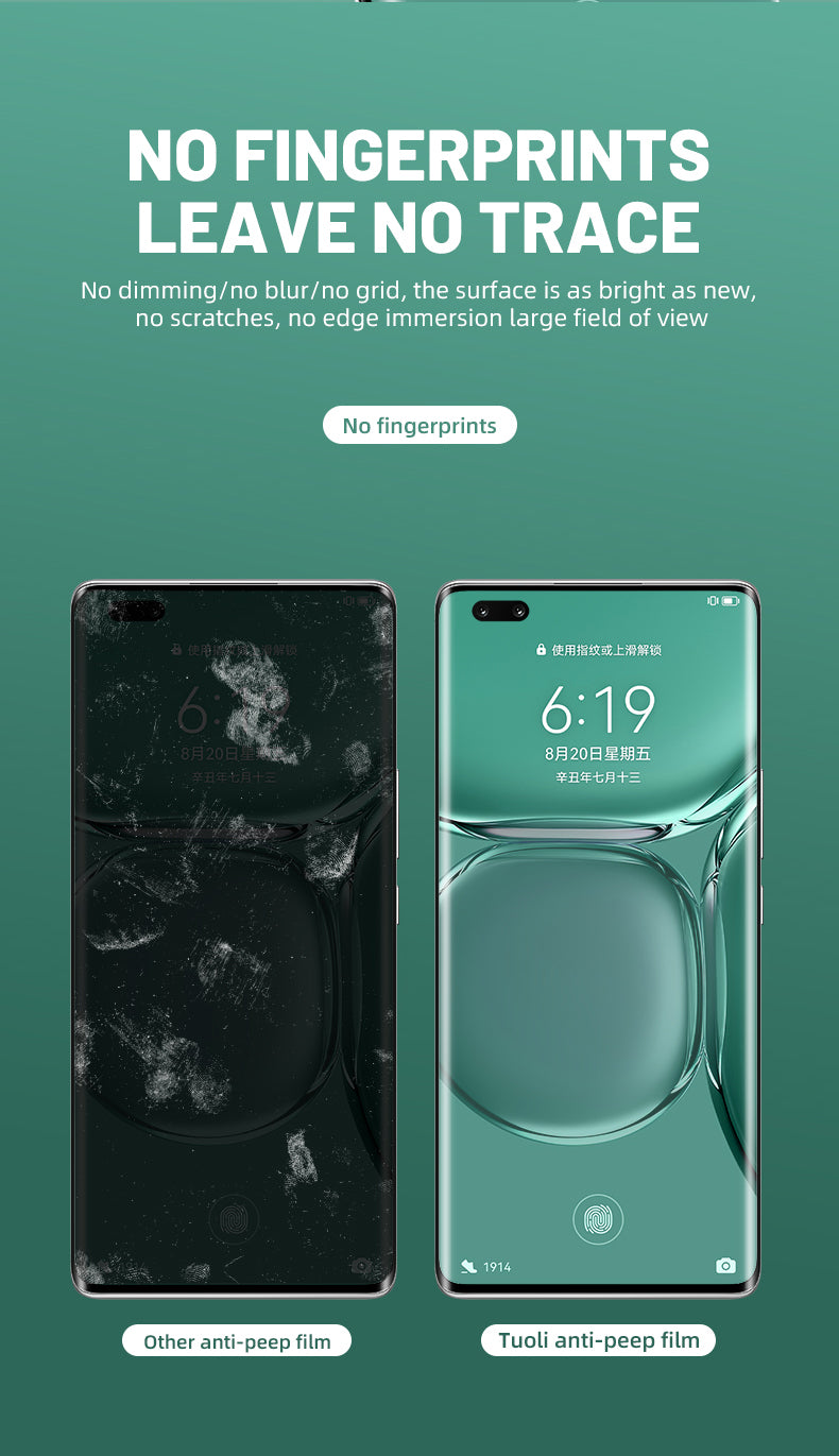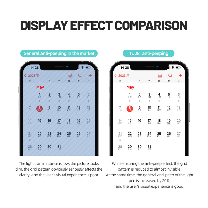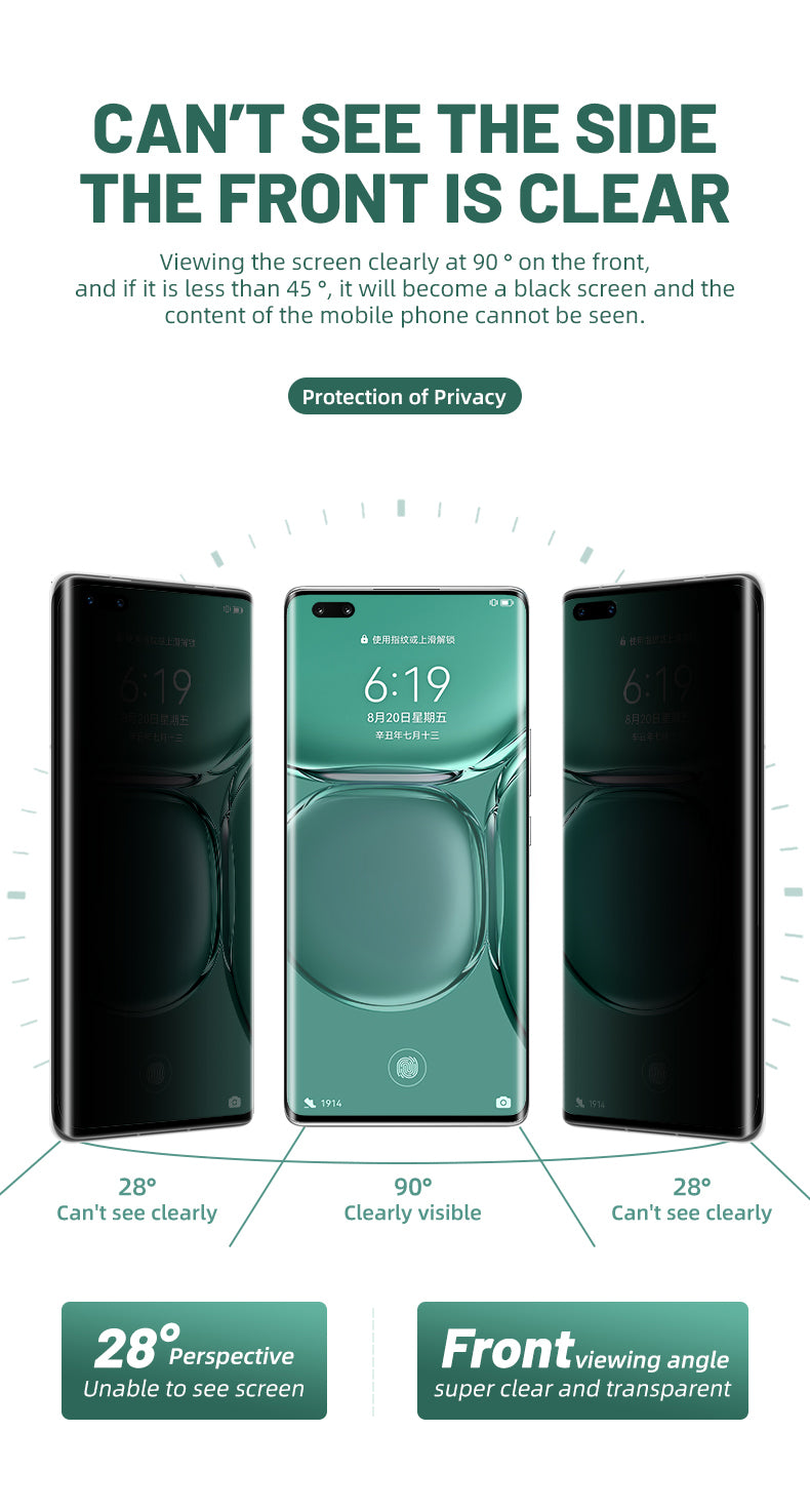 The privacy screen protection film is a combination of physical polarizing technology and shutter technology, so that the information displayed on the screen can only be read by the user, and people watching from both sides can only see the dark picture. So as to effectively protect business secrets and personal privacy. Whether working, studying, communicating or playing, you can use your computer and mobile phone more freely. Help the company's senior business personnel, lawyers, consultants, financial personnel, etc. to avoid business losses caused by screen information leakage when using electronic devices. With a privacy Screen Protector, you can do whatever you want in the office, on the go, in public and in any environment.